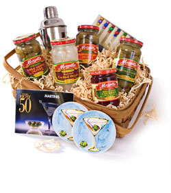Welcome to Happy Hour! This deluxe basket is the ideal gift for every cocktail mixologist. Perfect your martinis and other cocktails with our fine selection of specialty olives and garnishes.